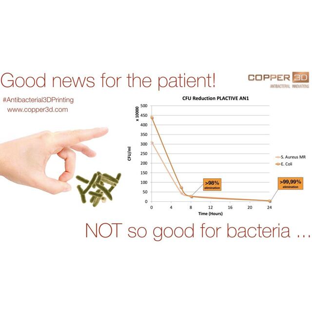 Copper3Dの『PLACTIVE AN1』は、チリおよびアメリカの2つの微生物学研究所で確認された抗菌特性を有しており、黄色ブドウ球菌(MRSA)および大腸菌(DH5α)を最初の6時間で95%まで低下させ、 その後8~24時間で99.99%を除去することができる抗菌作用フィラメントです。